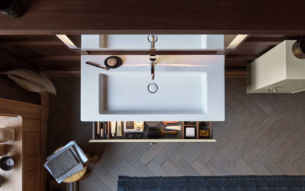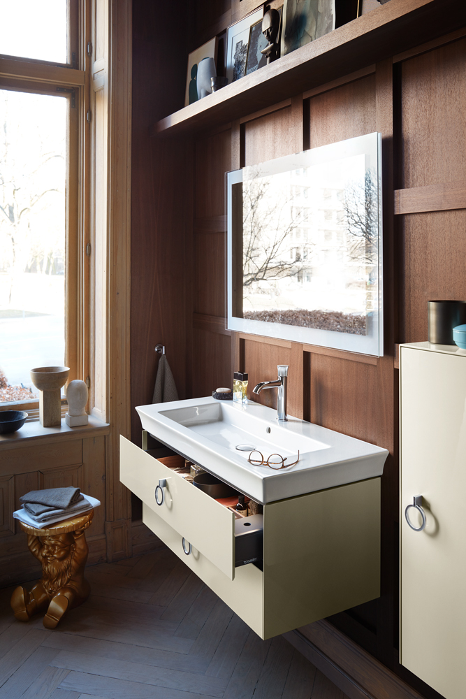 الأدراج ذاتية الإغلاق ومجهزة بمقابض أثاث متحركة على شكل حلقة. يتم تشغيل وإيقاف الأدراج المضيئة تلقائيًا عند فتحها وإغلاقها.